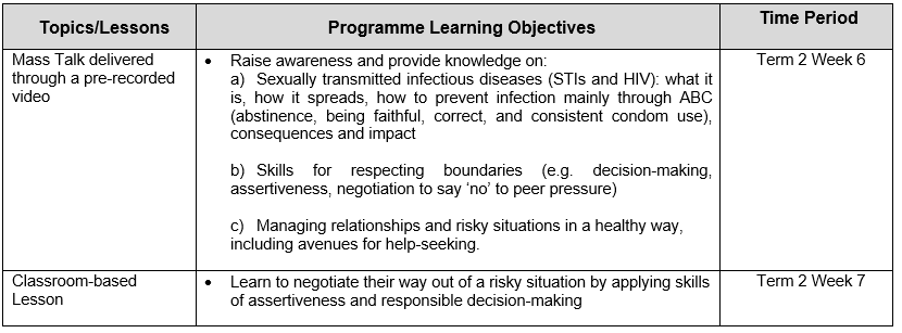 9. Students are taught skills such as decision-making, assertiveness and negotiation to say “no” to sex and negative peer pressure. They also learn that the impact of STIs/HIV extends beyond themselves and involves their family, and the importance of responsible decision-making and seeking help. Abstinence and upholding family values are the key messages.